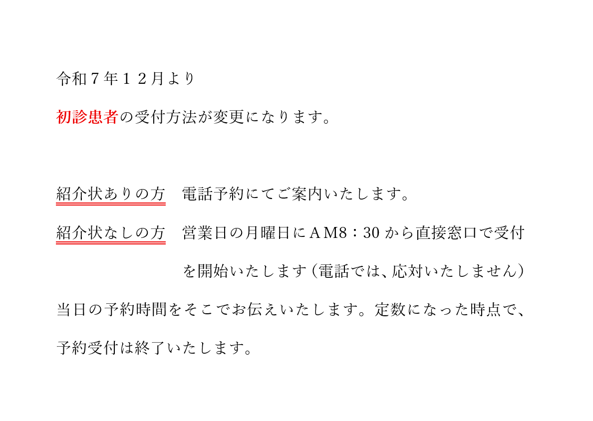 | その他 | 完全予約制 電話予約 【受診に必要なもの】 健康保険証(マイナンバーカード利用可) ※お持ちの方は以下のものもご持参ください。 診察券 紹介状(診療情報提供書) お薬手帳 |